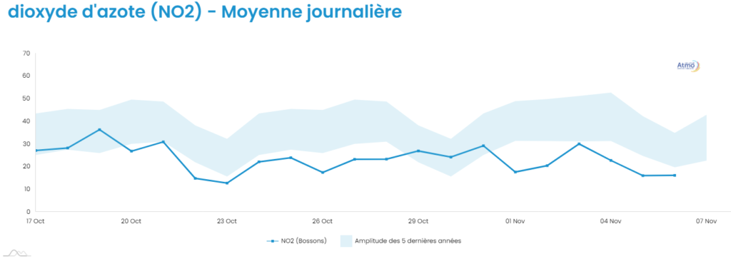 Moyenne du NO2 Bossons trafic : 23µg/m3 (habituellement entre 25 et 45)