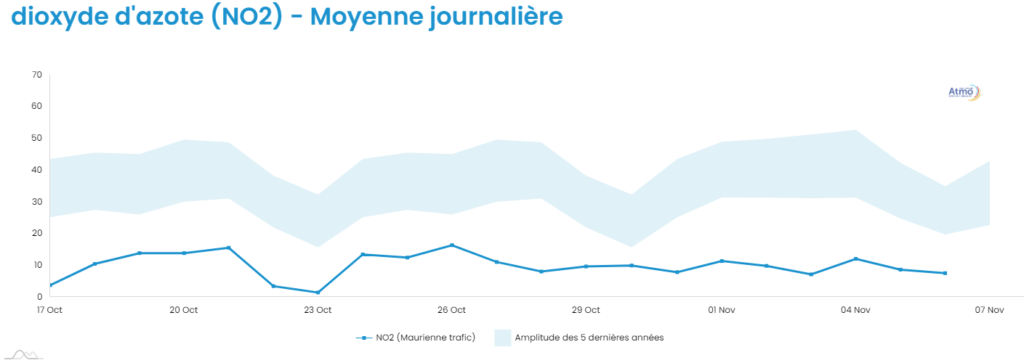 Moyenne du NO2 Maurienne trafic : 10µg/m3 (habituellement entre 25 et 40)