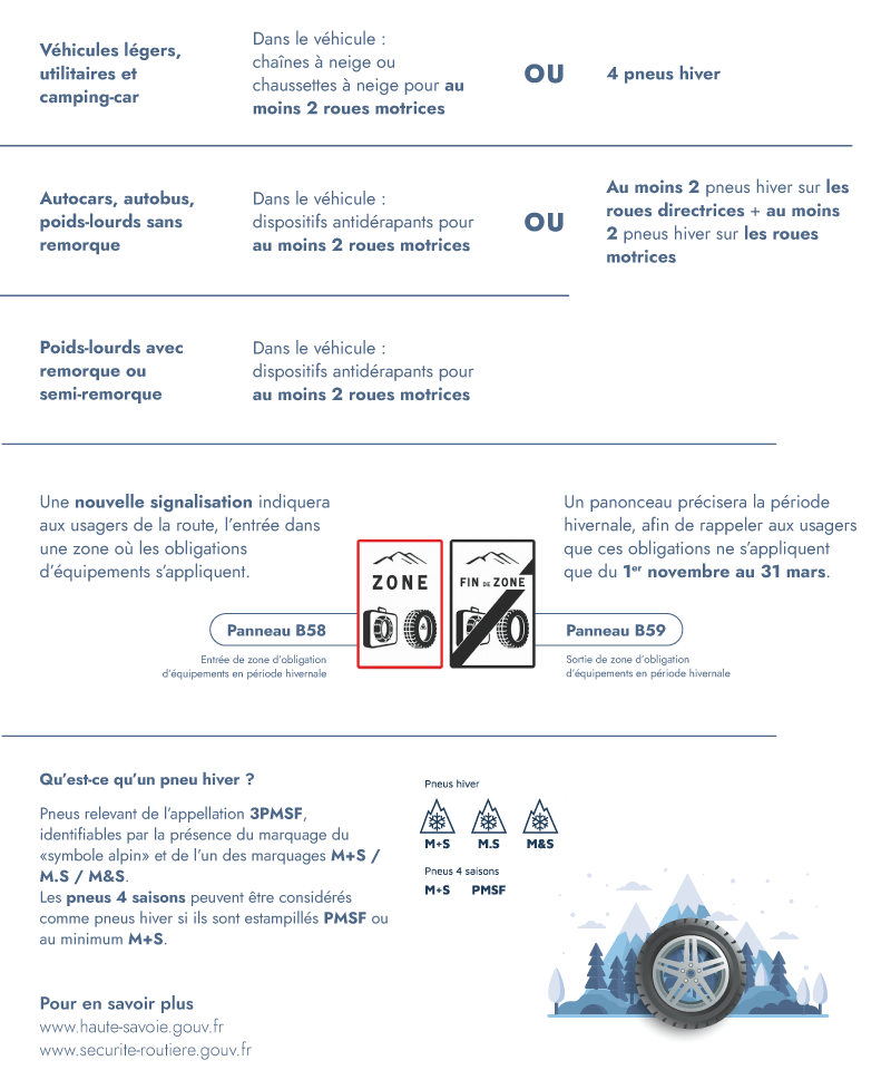 A partir de 2021, du 1er novembre au 31 mars, les équipements hivernaux, pneus neiges, chaines ou chaussettes à neige, sont obligatoires en Haute-Savoie. L’objectif est de réduire les risques d’accidents et de blocages sur la route en cas de forte chute de neige.