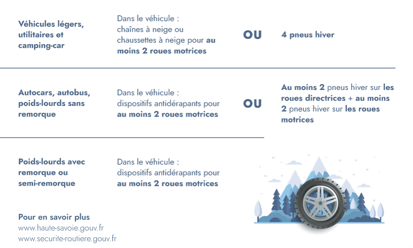 À partir de 2021, du 1er novembre au 31 mars, les équipements hivernaux (pneus neige, chaînes ou chaussettes à neige) sont obligatoires pour circuler en Haute-Savoie. L’objectif est de réduire les risques d’accidents et de blocages sur la route en cas de forte chute de neige.
