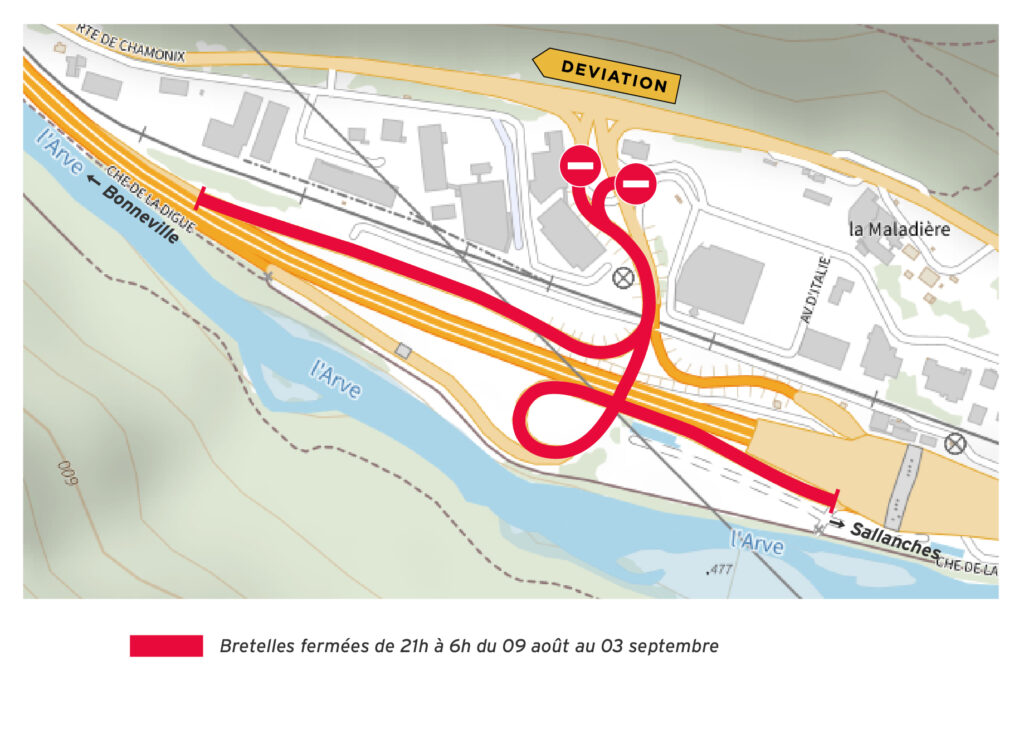 Dans le sens Genève-Chamonix, de 21 h à 5 h, les véhicules sortiront au diffuseur de Bonneville-Centre n°16 et reprendront l’A40 au même diffuseur (afin de contourner le pont en travaux). Les nuits concernées sont les nuits :