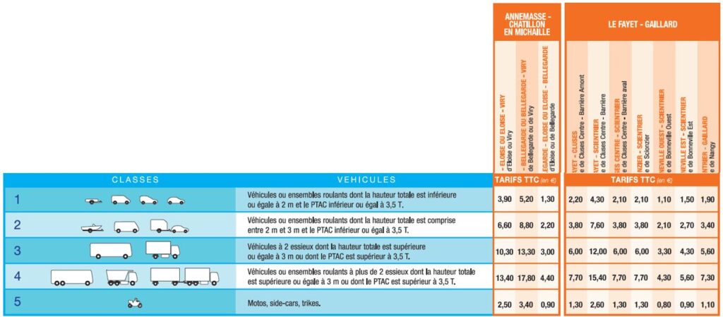 Pour les véhicules légers (classe 1), cette hausse se traduit par l’évolution de 0,10 € sur le tarif du péage de Cluses (barrière en pleine voie), Cluses-centre (entrée/sortie n°19), Scionzier (entrée/sortie n°18) et Bonneville-ouest (entrée/sortie n°16), les autres tarifs des véhicules légers restent inchangés. Pour les motos (classe 5), les tarifs n’évoluent pas. Les nouveaux tarifs pour les classes 2 à 4 sont indiqués dans la grille ci-après.